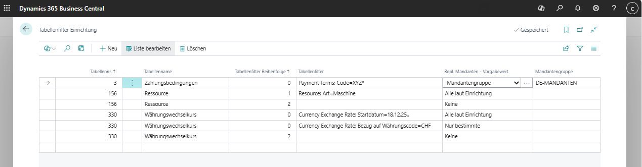 Tabellenfilter Einrichtung