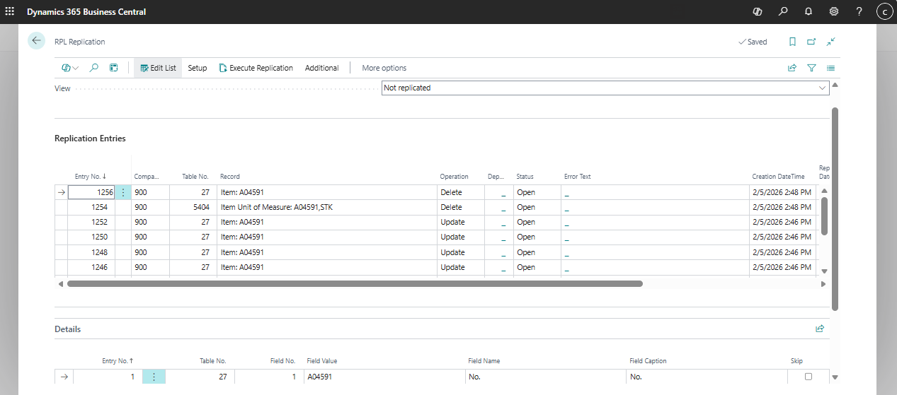 When a new record is created, an Insert entry is created, which creates the primary key in the respective target company. In some situations, the insert entry may not be created. In this case, the record is then automatically created with the modify entry as well. With the Modify entry, the remaining fields are populated, or if there is no insert entry, the record is created (note that in this case all fields according to the setup are rolled out once). Deleting a table record creates a Delete entry. Each entry contains detail lines with information regarding the individual fields. By clicking on "Replication Entries" or "Details", you can expand and collapse these lines respectively.