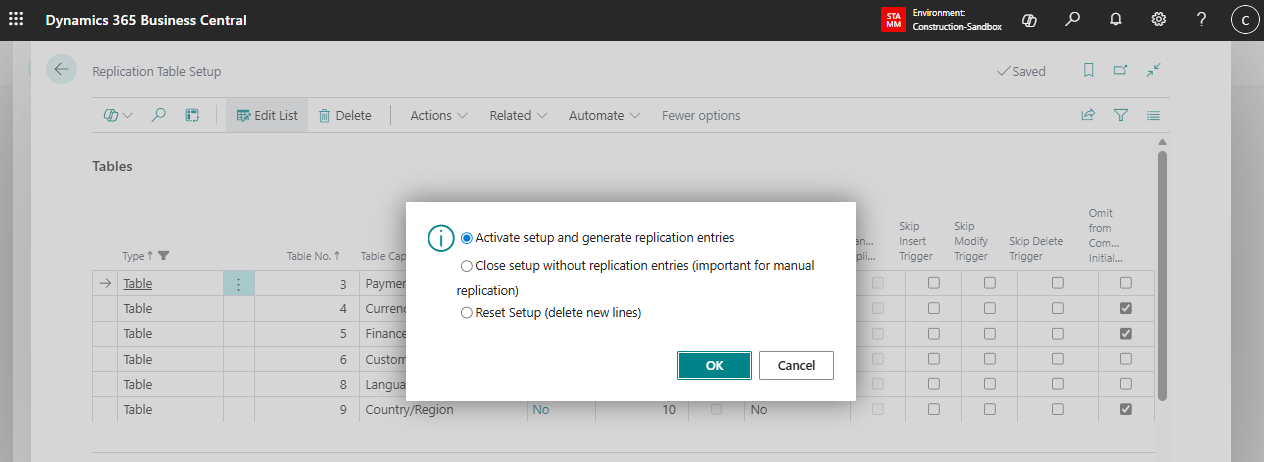 When closing the "Replication Setup Tables" page, a prompt appears if at least one line with "New = Yes" exists: