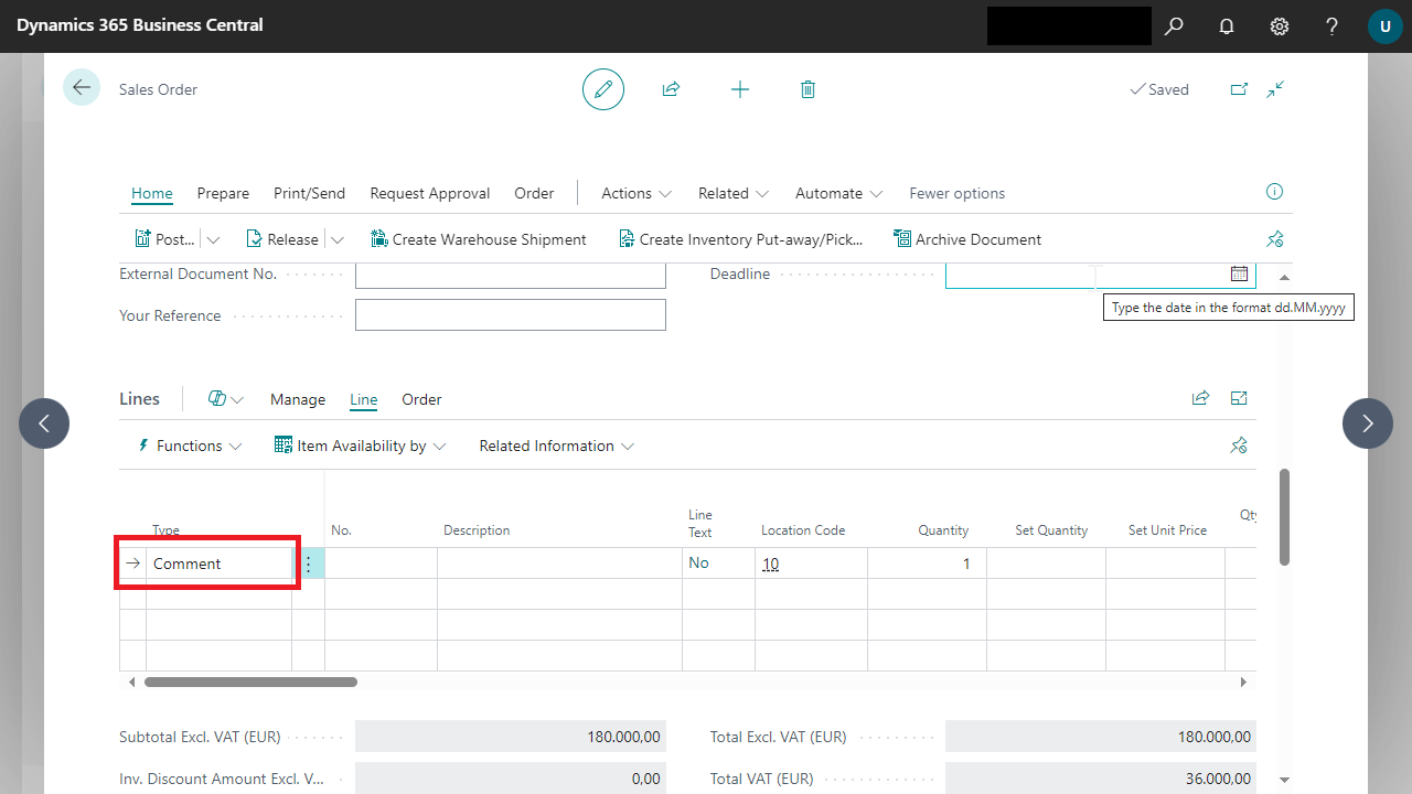 the selected sales order lines in the text lines are converted into remark lines.The type is then "Remark".
