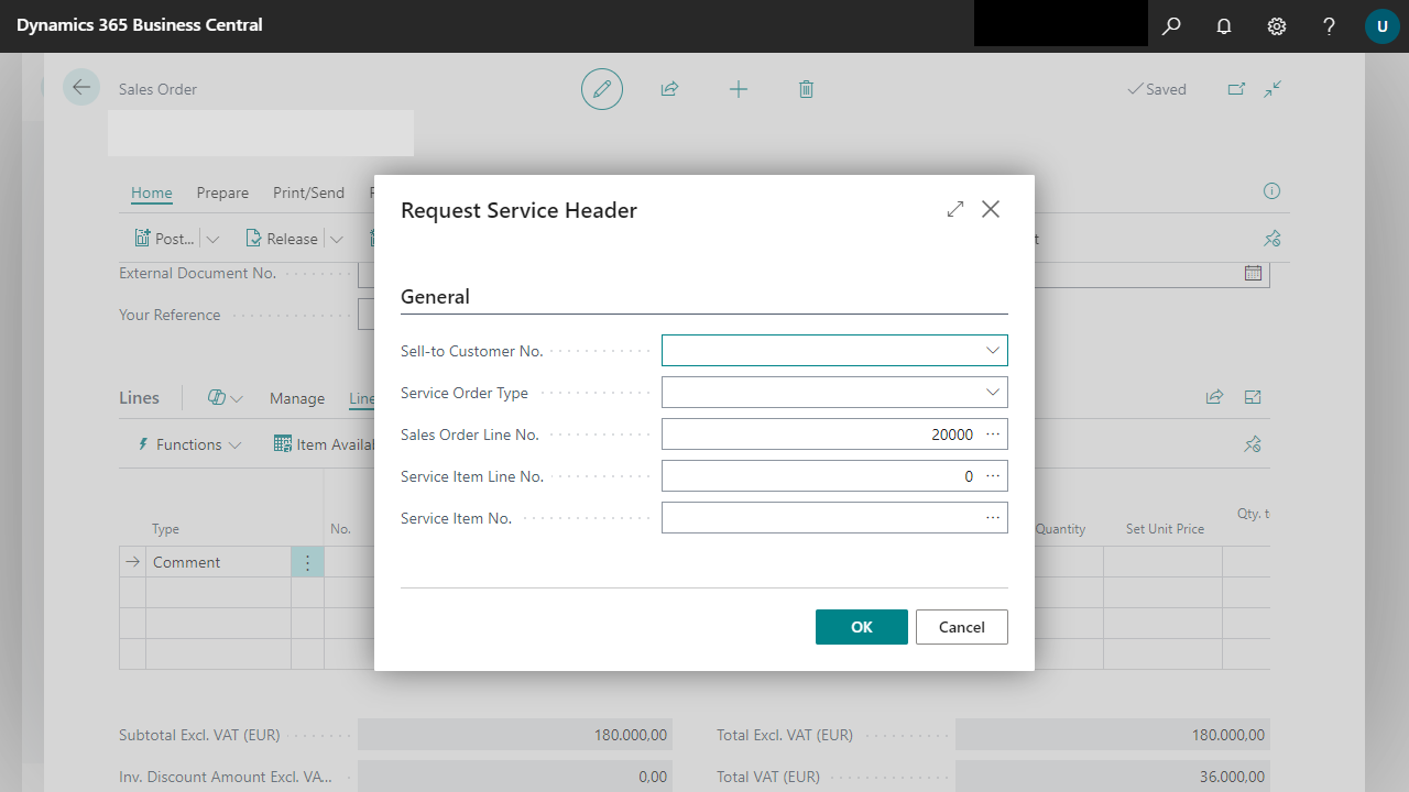 - A new service line is created for each selected sales order line. The type and no. are taken from the type and no. fields in the sales order line. The quantity comes from the quantity field from the sales order lines.