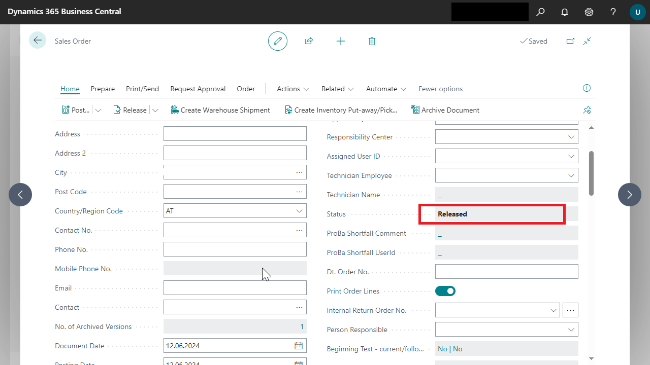 The "Create service order" function can only be called up if the status of the sales order is set to Released.