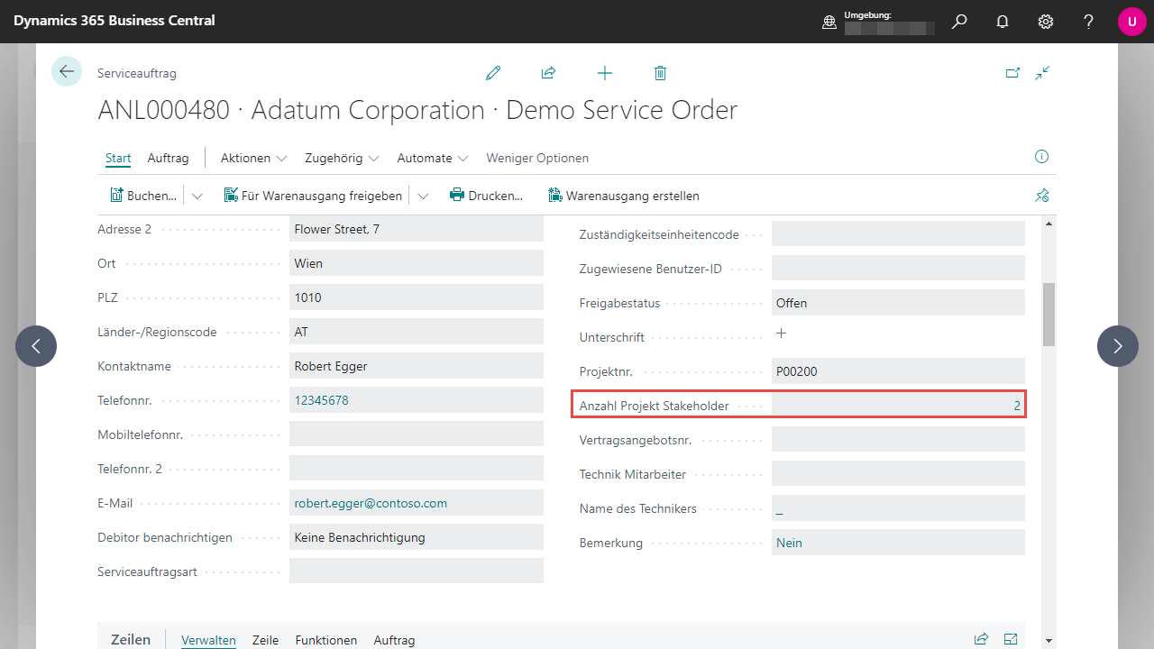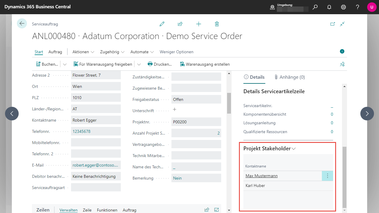 Außerdem finden Sie in den definierten Service Pages eine FactBox Projekt Stakeholder, welche pro Stakeholder den verknüpften Kontaktnamen anzeigt.