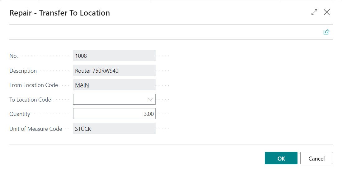 The window Repair - Transfer To Location opens when you call up the "Transfer" function, where the destination Location and quantity for transfer can be recorded.