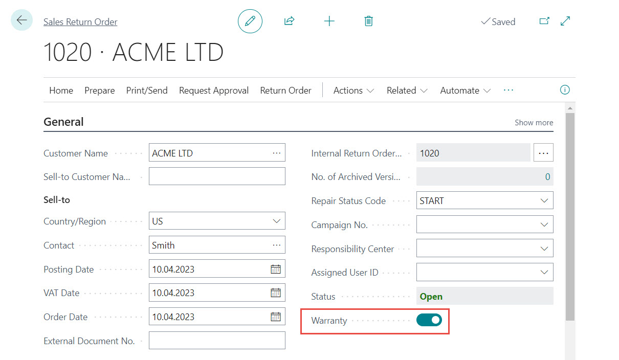 The field can be automatically updated via the Repair Status. The "Warranty" indicator is passed on to the document lines in the Sales Return Order. It cannot be overridden in the lines, i.e. Items from warranty cases cannot be used together with Items from other business cases in one document.