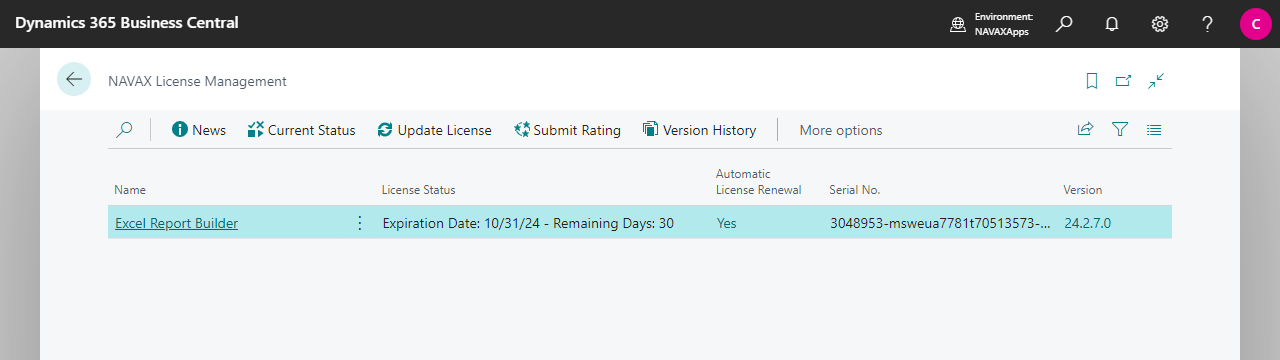 The NAVAX License Management page displays the current license status of the NAVAX extensions resp. the Excel Report Builder. A NAVAX extension can be tested or used free of charge for 30 days after installation. After that, the extension can only be used with a valid license.
