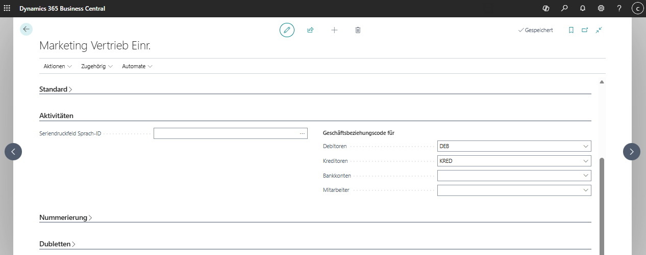 Aus Kontakten (Tabelle 5050) können Kreditoren (Tabelle 23) erstellt werden. Die Geschäftsbeziehung (Tabelle 5054) wird dann von BC automatisch erstellt. Voraussetzung dafür ist eine Einrichtung in der "Marketing Vertrieb Einr.", die beispielsweise so aussehen kann (Geschäftsbeziehungscode für Kreditoren):