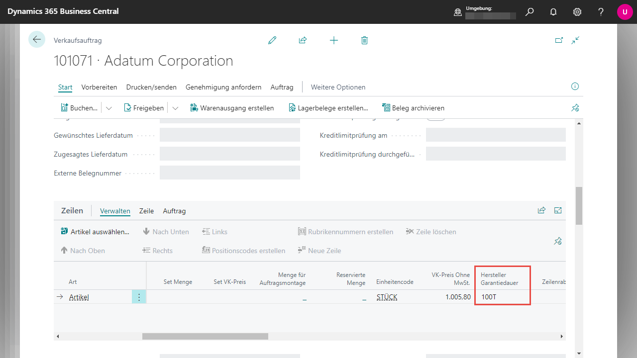 Die Hersteller Garantiedauer wird bei Anlage einer zugehörigen Verkaufsauftragszeile anhand des Wertes aus dem Kreditor befüllt.
