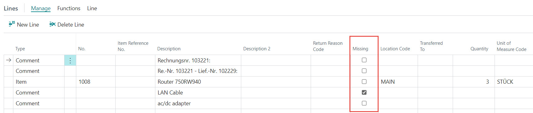 The components from the scope of delivery are written in text form (e.g. using a Standard Text) in the Return Order Lines. Those parts that are missing are marked with a "Missing" in the row.
